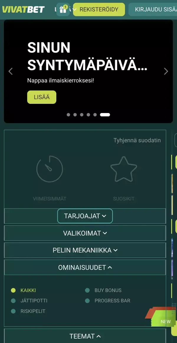 Mobiilissa voit selata pelintarjoajia kuten Pragmatic Play, NetEnt, Play'n GO, Evolution Gaming, Quickspin, Relax Gaming, Thunderkick, Hacksaw Gaming, iSoftBet, Wazdan ja muita. Näet myös pelin tiedot infopaneelissa, mukaan lukien kyseiselle nimikkeelle näytetyn RTP:n, koska yhtä yleistä kokonais-RTP-sertifikaattia ei ole. Jos pidät nopeasta valinnasta, voit avata Vivatbet-kasinon kolikkopelit ja siirtyä pelistä toiseen poistumatta kategoriasta.
